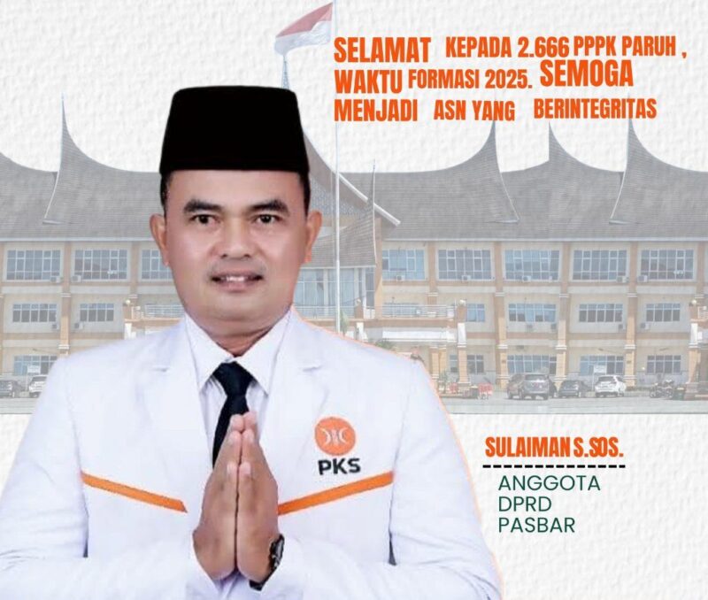 PASAMAN BARAT – Pelantikan ribuan Pegawai Pemerintah dengan Perjanjian Kerja (PPPK) paruh waktu di lingkungan Pemerintah Kabupaten Pasaman Barat mendapat perhatian khusus dari kalangan legislatif. Anggota DPRD Pasaman Barat, Sulaiman S.Sos, menyampaikan apresiasi dan ucapan selamat kepada 2.658 pegawai yang resmi dilantik pada Jumat (23/1/2026).